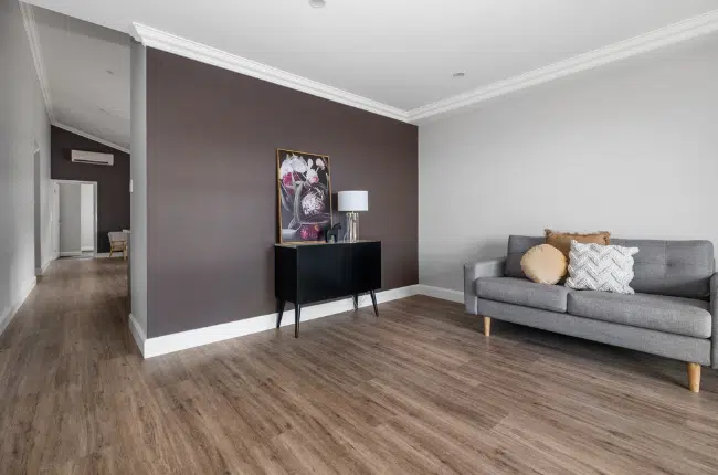 The front of the house has an inviting porch and the entrance opens into a hallway, allowing plenty of privacy. The bedrooms and living area are distinctly separated. The Master Bedroom with ensuite and generous Walk in Robe are to your left and behind that, via entry through another part of the hallway, are the other bedrooms, laundry and bathroom. The toilet is easily accessible for visitors without encroaching on the privacy of those of the second and third bedrooms.